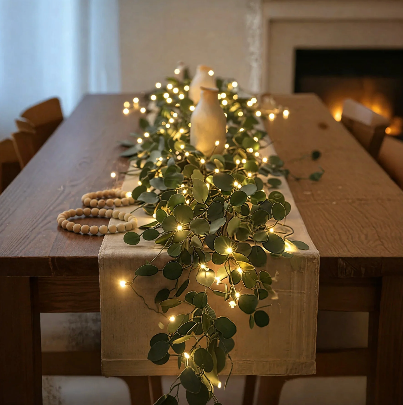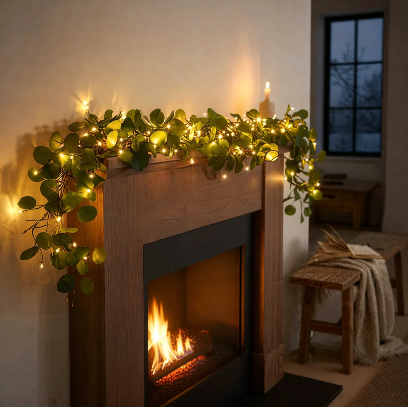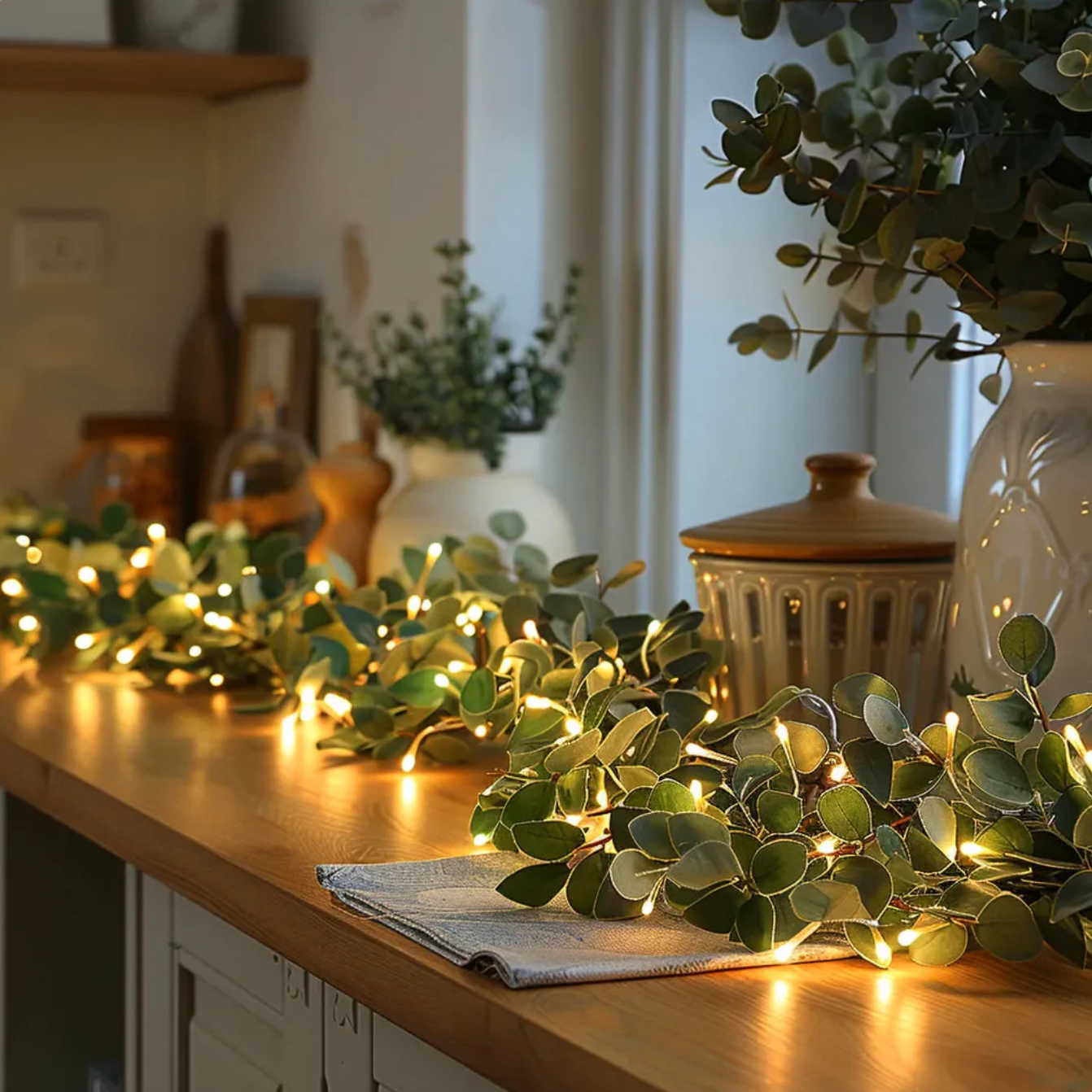 Dekoratives LED-Lichtband mit realistischen Blättern. Batteriebetrieben, warmweiß, kabellos – für sofortige Atmosphäre an Spiegeln, Regalen, Wänden oder Vitrinen.